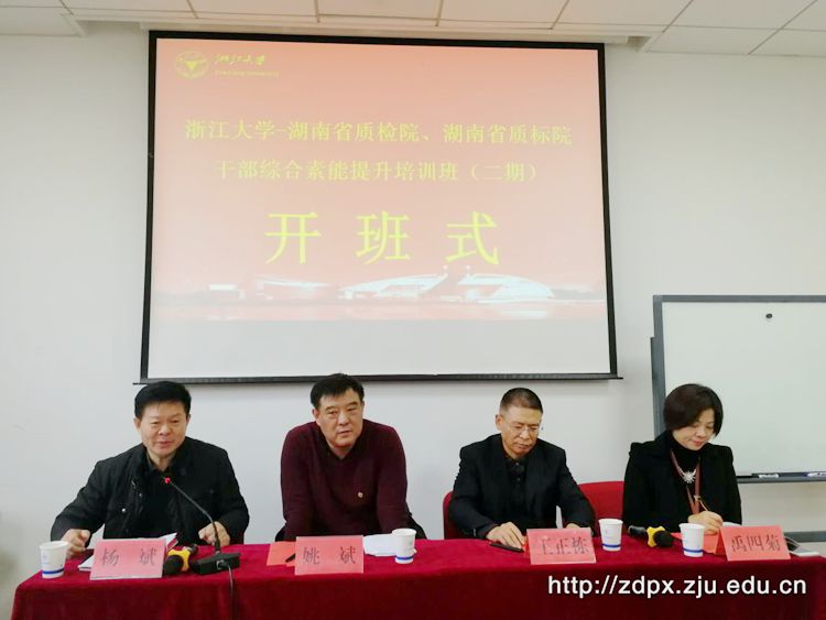 12月3日上午,湖南省质检院、湖南省质标院干部综合素能提升培训班(二期)在浙江大学华家池校区举行开班式。湖南省产商品质量监督检验研究院总工程师姚斌、湖南省质量和标准化研究院副院长杨斌、浙江大学继续教育学院副院长王正栋出席了开班式。来自湖南省质检院、质标院的45位学员参加了本期培训班学习。