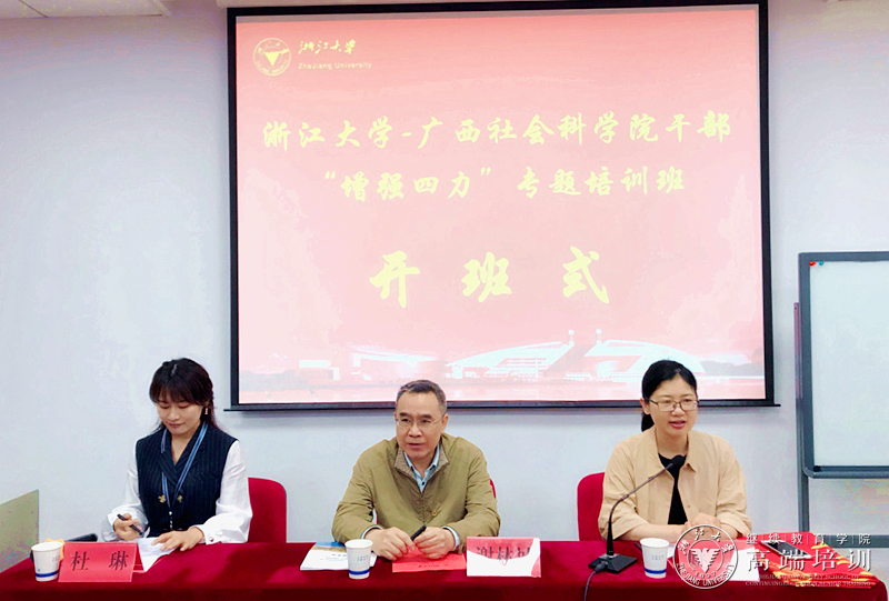 4月26日上午,广西社会科学院干部“增强四力”专题培训班在浙江大学华家池校区顺利开班。广西社会科学院党组副书记、副院长谢林城,浙江大学继续教育学院副院长姚青出席了本次开班式。