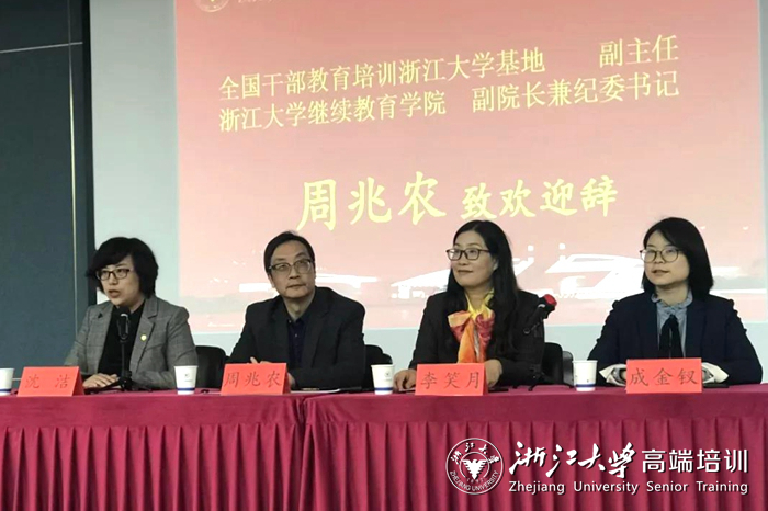周兆农首先致欢迎辞,对参加培训的全体学员表示热烈的欢迎,并介绍了浙江大学历史沿革、发展概况以及继续教育学院的办学理念、培训管理服务等方面内容。他表示,浙江大学122年的办学历史,从小到大,从弱到强,是几代浙大人奋力拼搏的结果,亦是广大海内外校友和社会各界人士无私奉献、倾力相助的结果。习近平主政浙江期间,先后18次来到浙大校园调研指导,多次作出重要批示,多次为师生作报告,甚至还把浙大作为自己的联系点。