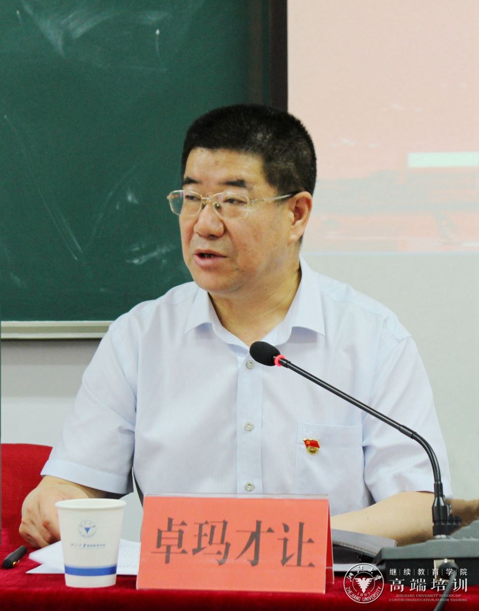 卓玛才让代表茅台集团党委对精心策划和组织此次培训的领导和老师表示感谢。他指出,为进一步加强党务干部队伍建设和提升基层党建工作水平,在总结以往培训成果的基础上,围绕干部在抓落实、促改革、谋发展中的知识空白、经验盲区、能力弱项,按照推动国企党建工作与改革发展深度融合“一任务两要点两清单”要求,采取“送出去”培训的方式,积极探寻干部党务工作的新思路、新方法,实现了“两个首次”:一是首次开展大规模党务干部专题培训,较以往综合类培训而言,专题培训主题更加明确,内容更为集中,参训人员专业性更强;二是茅台集团首次来浙大华家池校区开展培训,在干部教育培训方面做了新的探索。卓玛才让指出,在“文军长征”的历史上,浙大与贵州结下深刻渊源,而在80多年后的今天,此次从贵州来到浙大学习,重温这段历史和缘分,大家倍感亲切和自豪。同时,他对本次培训提出学习要求:一是提高政治站位,充分认识培训工作的重要性和紧迫性;二是不断深化认识,着力思考如何做好新形势下党建工作;三是严守学习纪律,树立和提升茅台党员干部良好形象。最后他祝愿所有学员学习愉快,学成所归。