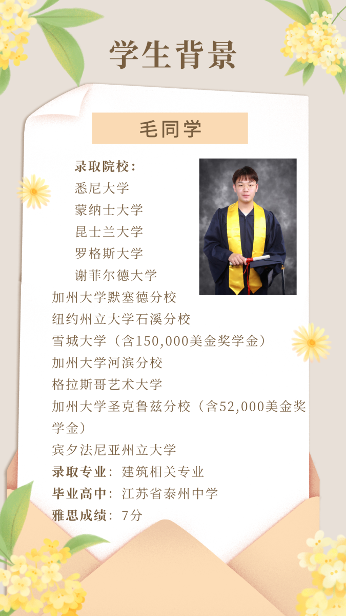 毛同学最终收获了包含悉尼大学(2025QS世界大学排名第18位)、蒙纳士大学(2025QS世界大学排名第37位)、昆士兰大学(2025QS世界大学排名第40位)、谢菲尔德大学(2025QS世界大学排名第105位)、罗格斯大学(2025U.S.NEWS排名第41位)、加州大学默塞德分校(2025U.S.NEWS排名第58位)、纽约州立大学石溪分校(2025U.S.NEWS排名第58位)、雪城大学(2025U.S.NEWS排名第73位)含15万美金奖学金、加州大学河滨分校(2025 U.S.News 综合排名第76位)、格拉斯哥艺术大学 (2025QS世界大学-艺术&设计专业排名第12位)、加州大学圣克鲁兹分校(2025 U.S.News 排名第84位)含52,000美金奖学金、宾夕法尼亚州立大学(2025 U.S.News 综合排名96)在内的14所名校offer,即将带着浙大赋予的深厚积淀,在国际舞台上继续书写他的精彩篇章。