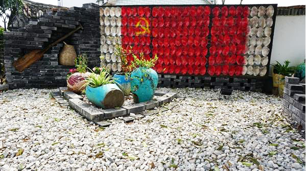 走在新桔城村,无时无刻不感受着细节美。整洁宽阔的水泥路旁,有序地摆放着黄绿分类的垃圾桶。偶遇一角,还可以看到极富艺术感的小品。村口的小卖部,就地取材、变废为宝,用蚌壳拼出了一面党旗,用小废弃的酒缸做成花盆,用养蚌人的桨做为陈列品,展现着当地生产劳作的地域特色。一个不经意间的回眸,充满创意的美丽庭院让你冷不防闯入,向女主人一探究竟。