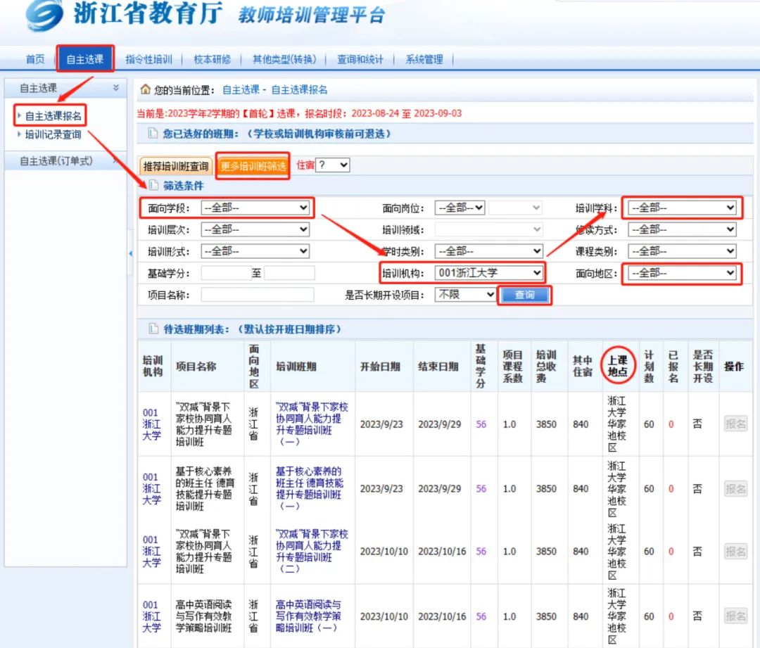 登录教师培训管理平台(https://pxglpt.zjedu.gov.cn)→自主选课→自主选课报名→更多培训班筛选→培训机构(001浙江大学)→面向地区(浙江省)→查询→报名