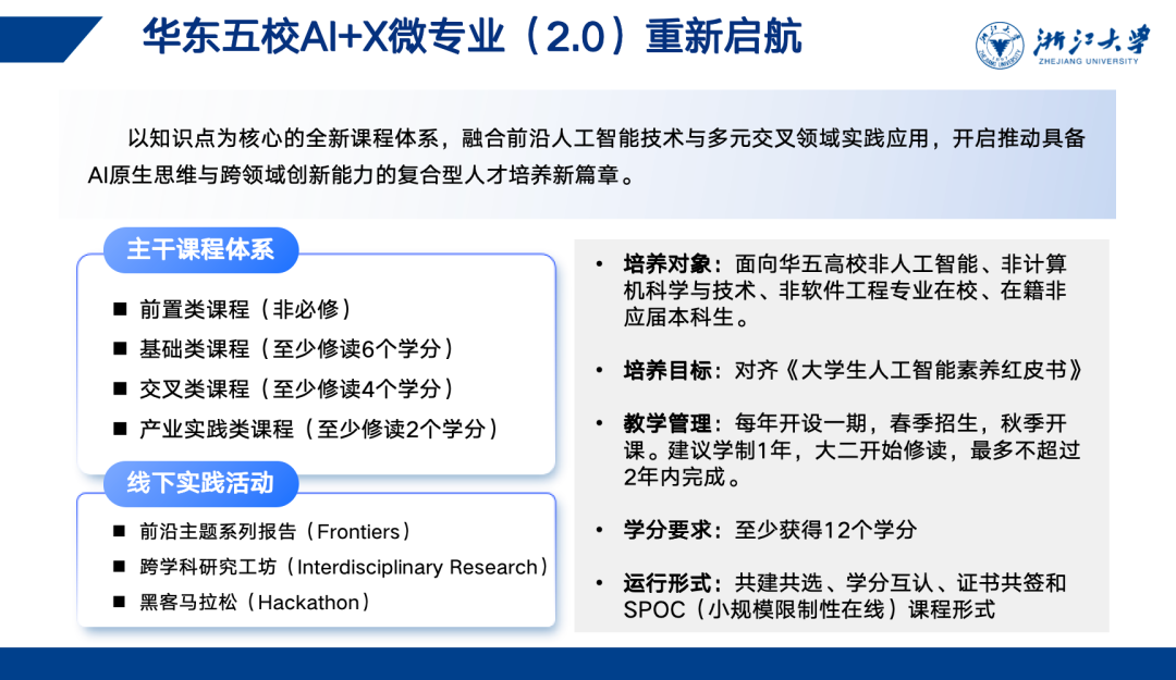 今年,华五微专业共建行动全面升级,在跨校合作中,浙江大学牵头全新迭代“AI+X”微专业。