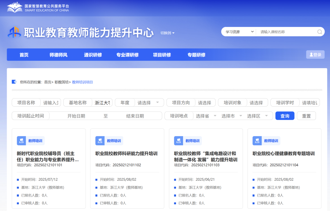 为深入贯彻落实全国教育大会精神和《教育强国建设规划纲要(2024—2035年)》要求,加强新时代高水平职业教育教师队伍建设。根据教育部教师工作司《关于组织国家级职业教育培训基地申报2025年培训项目的通知》(教师司函〔2024〕28号)精神,浙江大学围绕教育强国战略、教育家精神、专业与课程建设能力提升、科研创新等领域开设培训专题,获批5项国家级职业教育“双师型”教师培训项目。