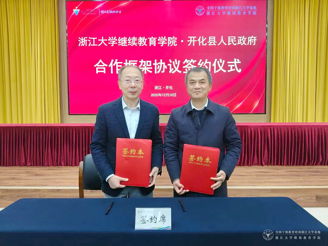 12月18日,浙江大学继续教育学院与开化县人民政府正式签订合作框架协议,标志着双方将开启合作新篇章,共同打造校地合作的典范样板。