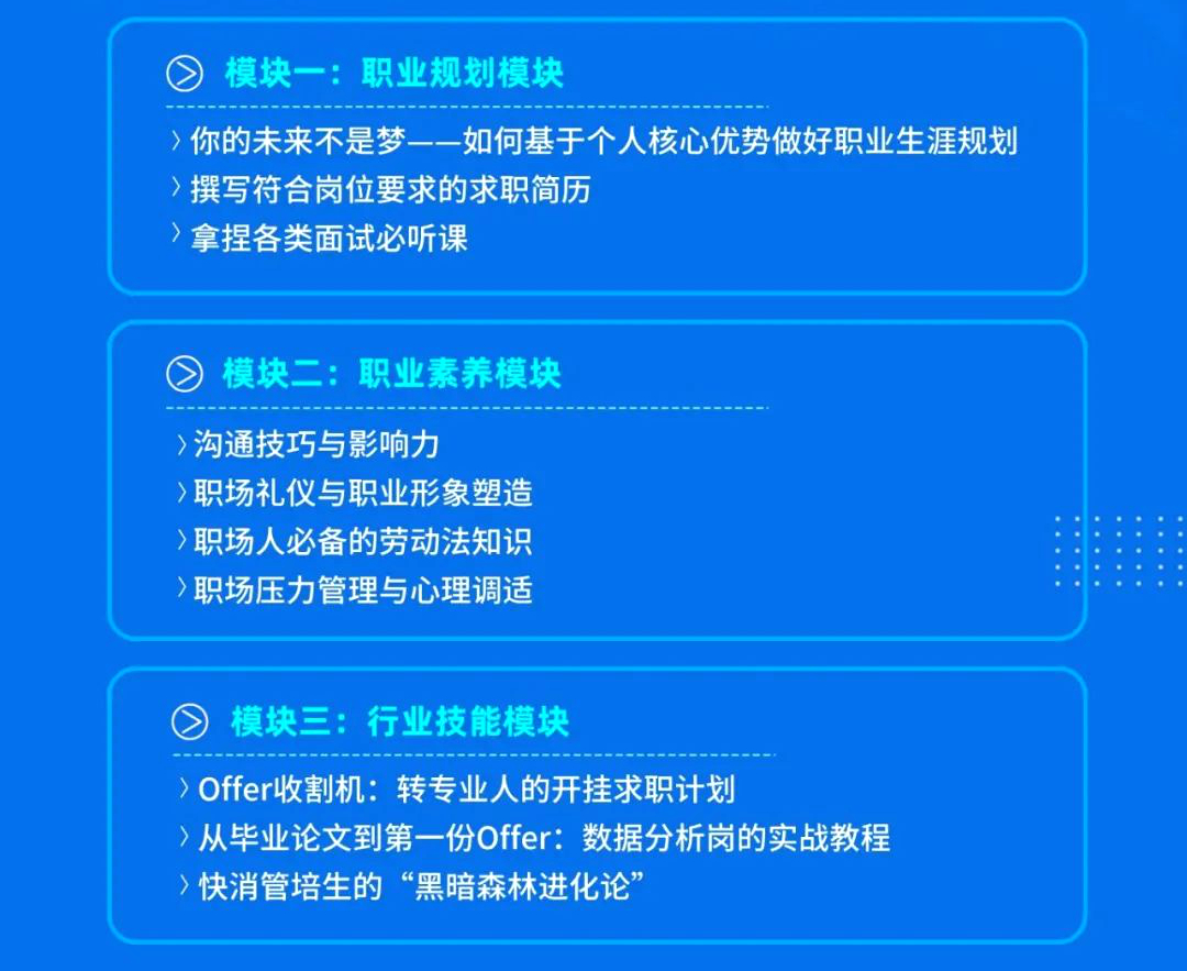 浙江大学为打通就业“最后一公里”,在教育部的指导下,现面向高校应届毕业生和职场新人,重磅推出“青春启航·职引未来”青年就业能力提升工程终身学习项目,通过实用性强的课程体系、双师制教学模式以及就业直通车服务,帮助高校毕业生等青年群体全面提升职场竞争力,为高校毕业生等青年群体高质量充分就业保驾护航。