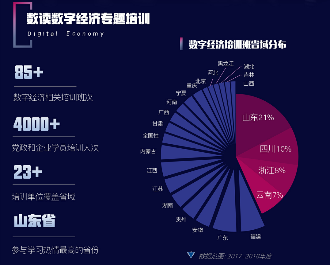 2018年以来,共有包括国家卫健委、教育部等多个国家部委重点班次在内的、覆盖全国23个省份的80余个班次来继教院学习数字经济相关专题。其中,山东省作为前来培训班次最多的省份,开办了相关班次20余个。